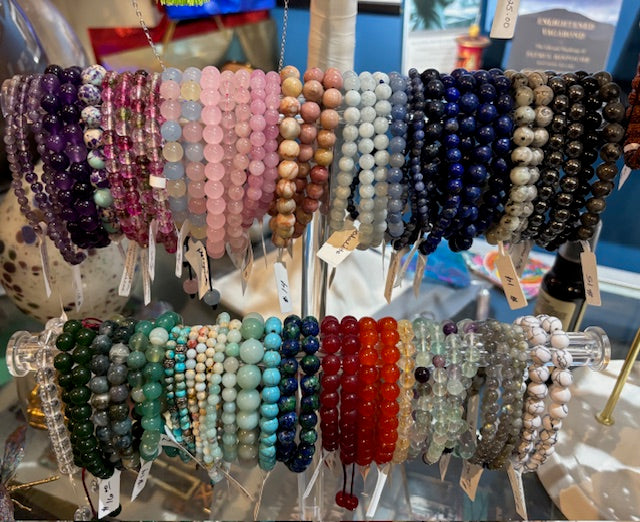 a Large Assorted Selection ranging from 4mm to 8 mm in various Semi Precious Stones.  Some are adjustable.  If there is a specific stone or crystal you are looking for please let me know if it is not listed here it can be ordered.  Selections change according to availability and requests.